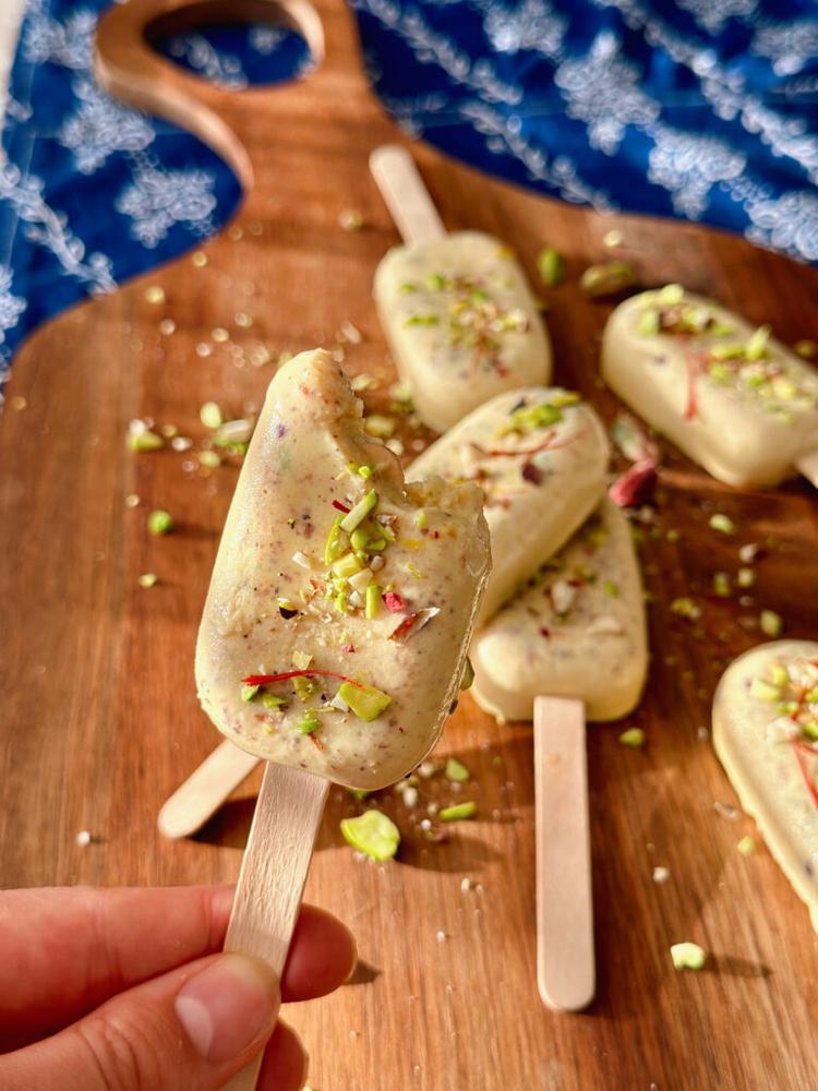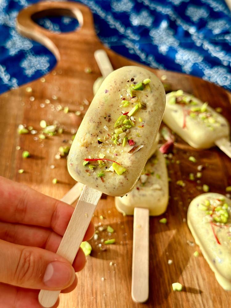 Tradičně se kulfi podává v misce nebo jako nanuk. Nanuky mají většinou kuželovitý tvar, který dostanou použitím kovových forem. Já jsem využila klasické silikonové, které mám doma, takže vzhledově jsem se tradiční verze úplně nedržela, ale postup jsem se snažila zvolit tradiční s ohledem na to, aby byl vhodný i pro intoleranci laktózy.